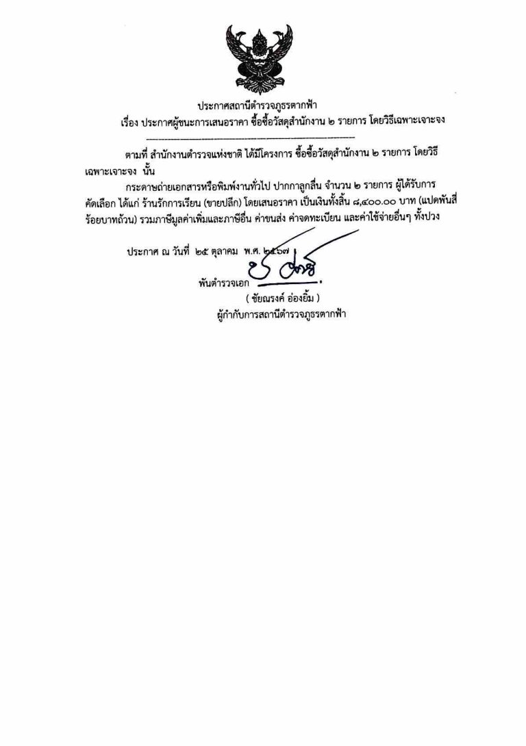 ประกาศผู้ชนะการเสนอราคา ซื้อวัสดุสำนักงาน